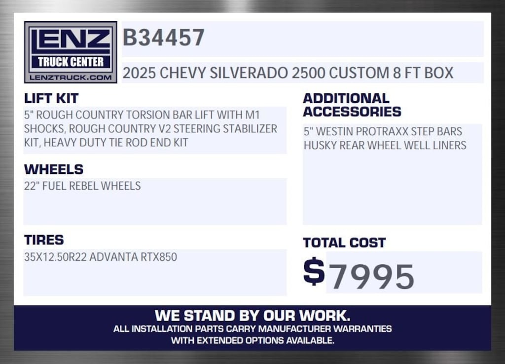 All of our vehicles are Lenz Certified by passing a rigorous safety inspection by our certified technicians. Each vehicle is prepped cosmetically and mechanically and ready to be delivered! We can ship your truck anywhere in the United States. Contact us to find out why Lenz Truck Center is selling a lot of trucks in a very different way. EXPECT TO BE IMPRESSED! We attempt to ensure every effort is made to assure the accuracy of these ads, however, errors may occur. We will do our best to keep all information current and accurate; however the dealership should be contacted for final pricing and availability. Every feature listed on the Factory window sticker may not be available. All prices are plus any applicable state taxes and service fees.