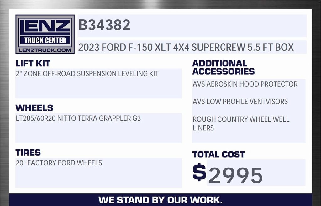 2" ZONE OFF-ROAD SUSPENSION LEVELING KIT, AVS AEROSKIN HOOD PROTECTOR, AVS LOW PROFILE VENTVISORS, ROUGH COUNTRY WHEEL WELL LINERS, LT285/60R20 NITTO TERRA GRAPPLER G3, 20" FACTORY FORD WHEELS, $2,995 IN VALUE!!