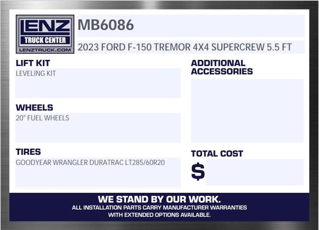 LEVELING KIT, FUEL WHEELS, GOODYEAR WRANGLER DURATRAC LT285/60R20 TIRES, ALL WORK DONE AT LENZ TRUCK!!!