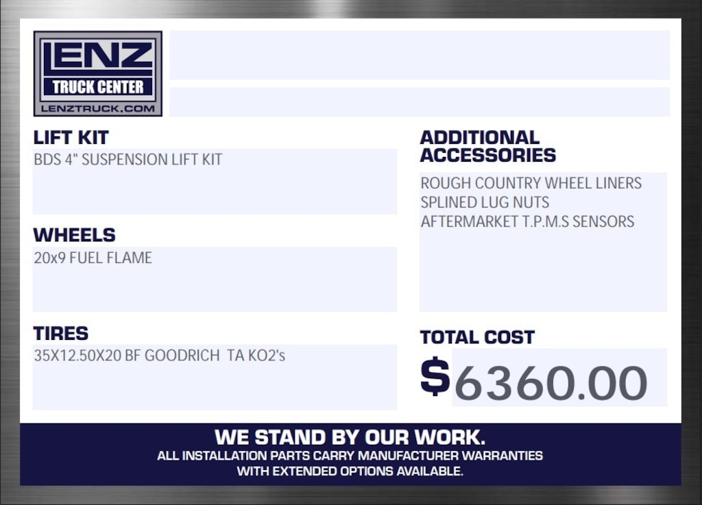 All of our vehicles are Lenz Certified by passing a rigorous 125 point inspection by our certified technicians. Each vehicle is prepped cosmetically and mechanically and ready to be delivered! We can ship your truck anywhere in the United States. Contact us to find out why Lenz Truck Center is selling a lot of trucks in a very different way. EXPECT TO BE IMPRESSED! We attempt to ensure every effort is made to assure the accuracy of these ads, however, errors may occur. We will do our best to keep all information current and accurate; however the dealership should be contacted for final pricing and availability. All prices are plus any applicable state taxes and service fees.