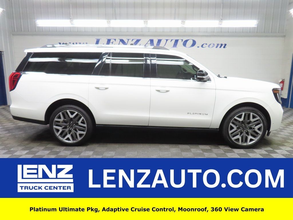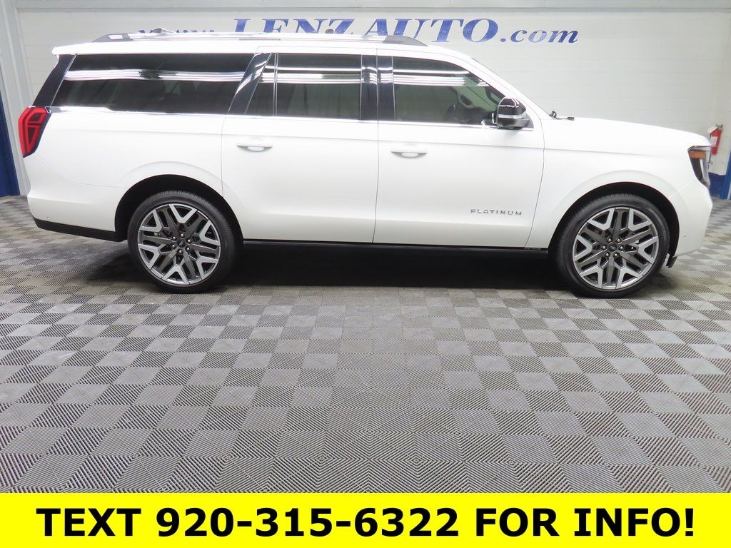 This 2025 Ford Expedition Max Platinum is finished in Star White Metallic Tri-Coat and equipped with a 4WD drivetrain. With 13,464 miles, this full-size SUV is available from Lenz Truck Center in Fond du Lac and is powered by a 3.5L EcoBoost V6 paired with a 10-speed automatic transmission, delivering confident performance and capability for family travel and towing needs.