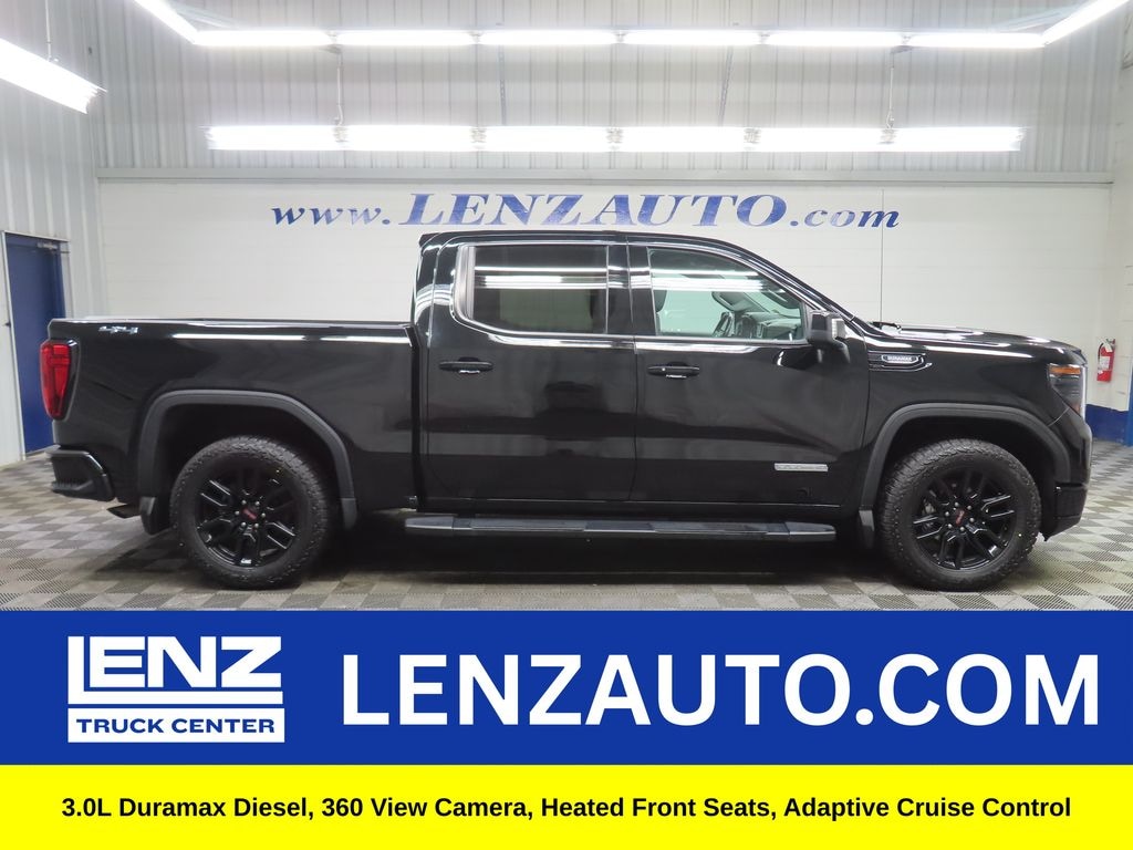 This 2023 GMC Sierra 1500 Elevation is finished in Onyx Black and equipped with 4x4 capability. It is powered by a 3.0L I6 diesel engine paired with a 10-speed automatic transmission. This full-size pickup is offered by Lenz Truck Center and delivers a strong blend of efficiency, torque, and modern truck capability.