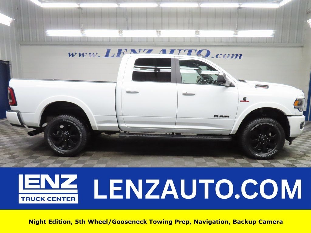 6.7L CUMMINS I6 TURBODIESEL, 6.4 FOOT BOX, 4X4, NAVIGATION SYSTEM, DUAL POWER HEATED AND COOLED FRONT BUCKET LEATHER SEATS, QUICK ORDER PACKAGE 2HH LARAMIE--- LARAMIE LEVEL A EQUIPMENT GROUP--- NIGHT EDITION---5TH WHEEL/GOOSENECK TOWING PREP GROUP--- TOUCHSCREEN CONTROLS, BACKUP CAMERA, KEYLESS ACCESS WITH PUSH BUTTON START, AUTOMATIC HEADLIGHTS, APPLE CARPLAY, ANDROID AUTO, VOICE RECOGNITION, BLUETOOTH HANDS-FREE, STEERING WHEEL CONTROLS, SPRAY IN BED LINER, REAR DEFROST, RAIN SENSING AUTOMATIC WIPERS, POWER SLIDING REAR WINDOW, INTEGRATED BRAKE CONTROLLER, HEATED STEERING WHEEL, FACTORY REMOTE START, DUAL CLIMATE, ADJUSTABLE POWER PEDALS, POWER FOLDING HEATED TRAILER TOW MIRRORS, 220 AMP ALTERNATOR, 2ND ROW IN FLOOR STORAGE BINS, 4G LTE WI-FI HOT SPOT, AUTO HIGH BEAM HEADLAMP CONTROL, BLACK EXTERIOR MIRRORS, BLACK EXTERIOR TRUCK BADGING, BLACK HEADLAMP BEZELS, BLACK INTERIOR ACCENTS, BLACK RAM HEAD TAILGATE BADGE, BLACK TAIL LAMP BEZELS, BODY COLOR DOOR HANDLES, BODY COLOR GRILLE SURROUND, CLEARANCE LAMPS, ELECTRONICALLY CONTROLLED THROTTLE, PAINTED FRONT BUMPER, PAINTED REAR BUMPER, PANIC ALARM, POWER STEERING, POWER WINDOWS, RAIN SENSITIVE WINDSHIELD WIPERS, REMOTE TAILGATE RELEASE, SECURITY SYSTEM, 6-SPEED AUTOMATIC TRANSMISSION, FIRESTONE TRANSFORCE AT2 LT285/60R20 TIRES, 20" X 8.0" BLACK PAINTED ALUMINUM WHEELS, 3.73 AXLE RATIO!!