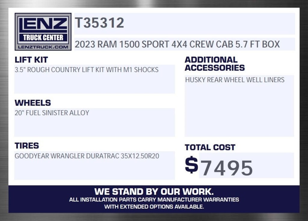 NEW ROUGH COUNTRY 3.5" LIFT KIT WITH M1 SHOCKS, NEW HUSKY REAR WHEEL WELL LINERS, 20" FUEL SINISTER ALLOY WHEELS, 35X12.50R20 GOODYEAR WRANGLER DURATRAC TIRES, OVER $7,495 IN VALUE!! ALL WORK DONE AT LENZ!